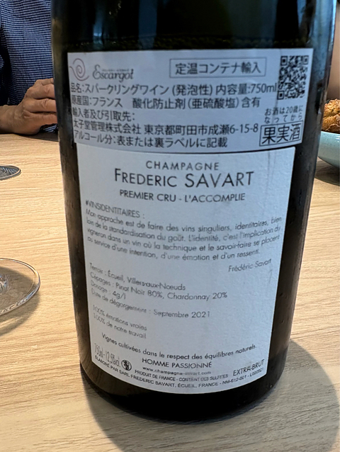 NV フレデリック・サヴァール ラ・コンプリ 1erクリュ ヴィエイユ・ヴィーニュ エクストラ・ブリュット エキュイユ モンターニュ・ド・ランス シャンパーニュ/フランス vinicaに感謝✨ 9/27ワイン会@神田三崎町 divino・その1 「運営サービス終了」まで、残すところあと僅かとなり、あちらこちらでvinica繋がりのワイン会の報告が聞かれるようになりました。 この夏、缶チューハイばかり飲んでいた私も、久しぶりのワイン会に参加させていただきました。 最初の1本、乾杯のワインは江川さんから。当然、シャンパーニュです!(江川さんといえば…のドンペリではありませんが・笑) 最近、市場でまったく見かけなくなった、サヴァールのラ・コンプリ/L’ Accomplie。 外観は、非常に淡く柔らかな色合いのプラチナゴールド。泡のキメが「ナノレベルか⁉︎」と言いたくなるほど細かくて、美しく品のある泡立ち✨ 見ているだけでウットリです! ライムやグレープフルーツのような柑橘に赤リンゴの蜜、ジューシーな白桃を思わせる果実香、そして、ブリオッシュの香ばしさや微かな発酵バターのフレーバーも加わって、香りはとても複雑。 口当たりは非常に滑らかで、清涼感を感じる繊細な泡の刺激が心地良いです。 上品で爽やかな酸味と、クリアに透き通った果実エキスの旨み、チョークのようなカリカリっとした硬いミネラルのバランスが素晴らしく、優雅で上品な味わいですね♪ 余韻は長く深く…まるで深淵を目指しているような、その「ひたむきさ」が心に刺さりました。 バックラベルを見ると、使用されるぶどうは、ピノ・ノワール 80%、シャルドネ 20%のアサンブラージュ。 本拠地のあるエキュイユとヴィレール=オー=ヌードにまたがるエリアから収穫されたもので、WEB情報によれば、「ル・モンブノワ」という単一区画産だそうです。 ドザージュは、4g/Lのエクストラ・ブリュット仕様、デコルジュマンは2021年9月となっています。 ところで、ワイン名にある「Accomplie」というフランス語は、「完全な」「完璧な」とか、「理想的な」という意味の形容詞だそうです。 非の打ち所、ケチの付け所が見つからない、この素晴らしいシャンパーニュにピッタリだと思いませんか? そして、Accomplieという単語には、さらに、「成し遂げられた」「完了した」という意味があるそうです。 vinicaへの感謝と惜別の思いを「隠しテーマ」とした今回のワイン会の1本目として、まさに「完璧/L’ Accomplie」なシャンパーニュ✨ 江川さん、流石です! いまこのタイミングで開けるのに相応しい、素晴らしいシャンパーニュをありがとうございました♡