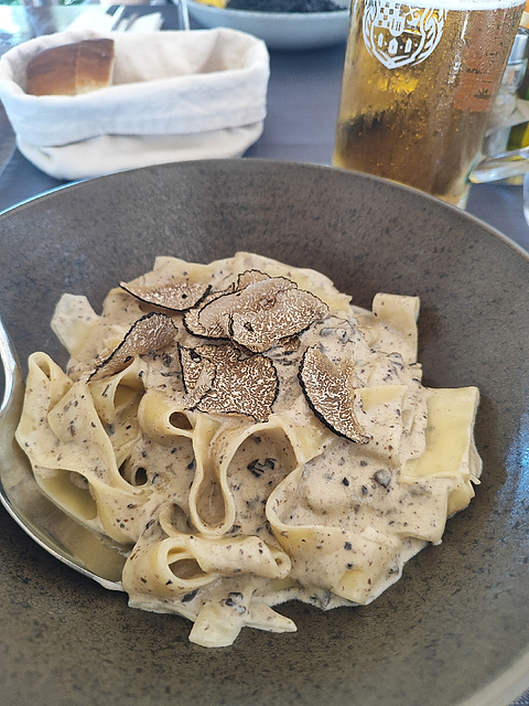 さてこちら世紀のヴィンテージ1982のCh.Lafon Rochetです。1982のボルドー飲むの初めてかもしれないです。初めから素晴らしい香り。 ミルク、ピーマン、ブラックカラント、タバコ、茎。カベルネの骨格がとにかく非常にしっかりしておりボディが強い。まだまだ元気でした。やはり1982ってすごいヴィンテージだったんですね。どんどん旨味が増していきました。ボルドー万歳。 ムリエト二日目お昼。人生で一番美味しいトリュフパスタでした。素晴らしい。