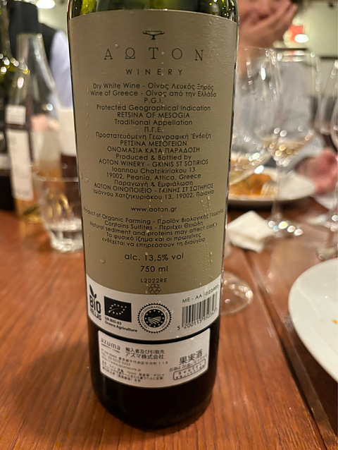 2022 アオトン・ワイナリー レッツィーナ・オブ・メソジア アッティカ/ギリシア vinicaに感謝✨ 10/2サンジョヴェーゼ会@西荻 ダ・マサ・その10 いつも変態ワインを持ち寄る「ワイン変質者の会」(命名:DaMasaさん)から発展したワイン会。 10本目は、なぜかギリシアの松脂入りの白ワイン、レッツィーナ(爆笑) 実は、この前にトスカーナの素晴らしいシャルドネを飲んでいますが、写真を撮り忘れたので割愛。 このワイン、醗酵中に1000Lあたり、600gのレッツィーニ(松脂)が加えられていて、この量は通常よりかなり多めらしいのですが、ベースワインが素晴らし過ぎて、松脂の風味をほとんど感じないぐらいの味わいでした。 サヴァティアノ100%ということなんですが、風味付けされていない、サヴァティアノの白ワインを飲んでみたいと思わされる仕上がりでした。 ギリシアのワイン、時々、とんでもない「モンスター」に出くわしますが、このレッツィーナもその中の一頭ですね♪