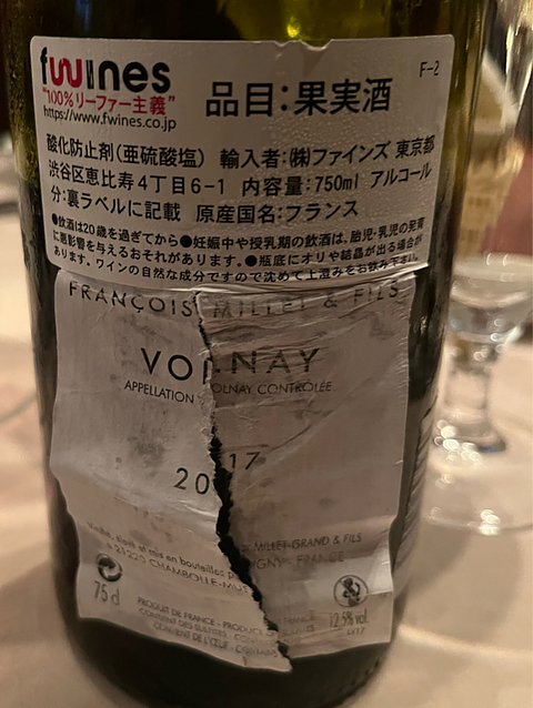 François Millet & Fils Volnay 2017 フランソワ・ミエ・エ・フィス ヴォルネイ この日はN様のアンジェ月例会でした。 次はショコラ_ココア様から。 これは美味しい。 ニュイらしいしっかりとしたピノ・ノワール。 いい作り手が丹精込めて育てた葡萄を醸したワイン。 8年で素晴らしい呑みごろです。 これで10年前の値段なら。 (>_<)