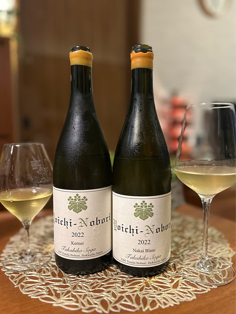 ふるさと納税 飲み比べ 左側ヨイチノボリ ミズキのケルナー 中井家で育てたケルナーを使って中井瑞葵さんがタカヒコさんと一緒に醸造したキュベ。 桃やライチが香りますが、ドライで柑橘のような酸ですっきりした味わい。