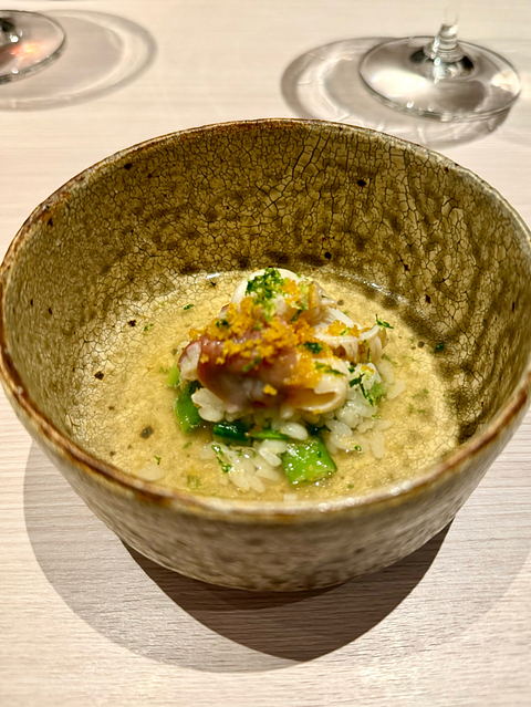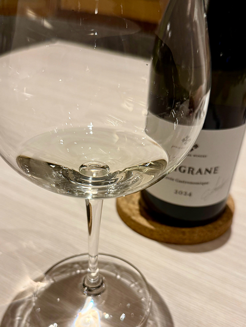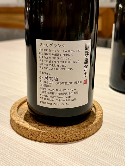 余市Loopでの日本ワインのペアリング・ディナー。 北寄貝にあわせて、平川ワイナリーのフィリグランヌ・キュヴェ・ガストロノミック2024をい頂きました。 とても淡い感じのストロー・イエローからリンゴや洋梨、ピーチにフラワー、カシス・バッズなどのハーブを感じ、果実味は平川さんらしいきちんとした凝縮感で酸とのバランスも良し。ミネラリーでドライないつもながら良く出来た混醸ワインでした。