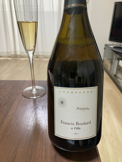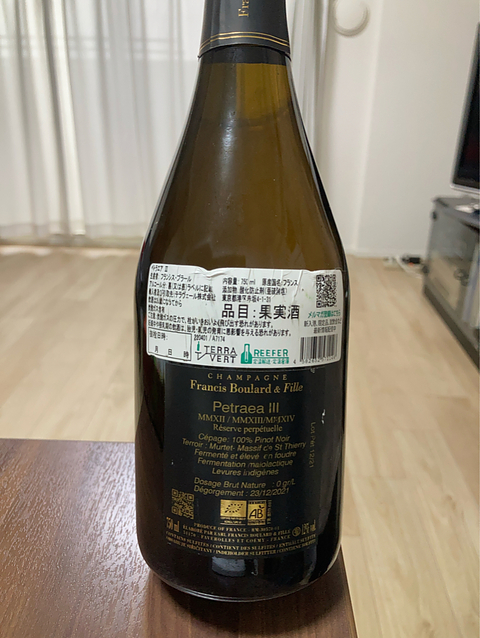 フランシス・ブラールのペトラエアⅢ。ブドウはモンターニュ・ド・ランスのマシフ・ド・サン・ティエリのレ・ミュレという区画のピノ・ノワール100%。活性化したライムストーンに砂が混じる土壌でミネラルが強く硬く力強いワインを産むとのこと。樽発酵・樽熟成、2012、2013、2014のパーペチュアル・リザーブのみを使用、マロラクテイック発酵、ドザージュ0g/L、デゴルジュマンは2021年12月です。味わいはピノ・ノワール100%のブラン・ド・ノワールですが穏やかなやさしい味です。ピノ・ノワールらしさはありますが攻撃的ではなく、ムニエのふくよかさとはまた違ったまろやかな味わいです。