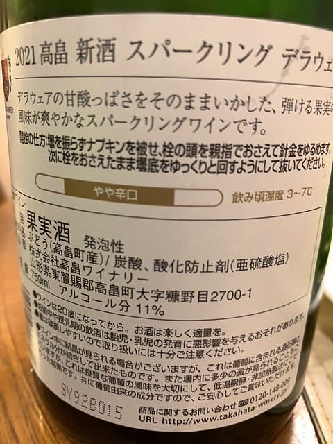 TAKAHATA WINERY 高畠 Sparkling Delaware 2021 新酒