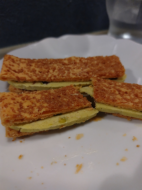 イタリア ルカ・べヴィラクーア これは美味しいっ!! アプリコットの香りから始まって ひとくち飲むとオレンジの味わい。 私の好物 シェフ特製 ピスタチオバターに ピッタリ合います。 ワインも最高に美味しいけど やっぱり シェフのピスタチオバターが たまらなく美味しい♪ パイ生地のシュガーの塩梅 バターの風味。 そこら辺の有名なケーキよりも 本当に美味しい。