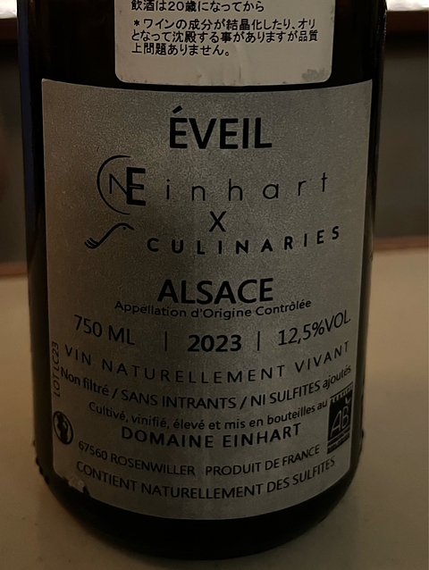 ドメーヌ・アインハルトのエヴェイユ・キュヴェ・エクスルーシヴ・キュリナリー 2023 フランス、アルザス オーセロワ35、リースリング35、ゲヴェルツトラミネール30 職場近くのワインバーにて(^^)