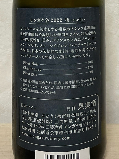 モンガク谷ワイナリーの杤(トチ)2022 日本、北海道 ピノ・ノワール70、シャルドネ12、ピノ・グリ9 明るいオレンジ色。黄色い花、花の蜜、ドライアプリコットの香り。トロンとした果実味、程よい酸味。 モンガク谷のトチを開けました♫ 色を見るとオレンジワインみたいです(^^) 味わいはオレンジワインよりも濃厚な感じでした(*^^*)