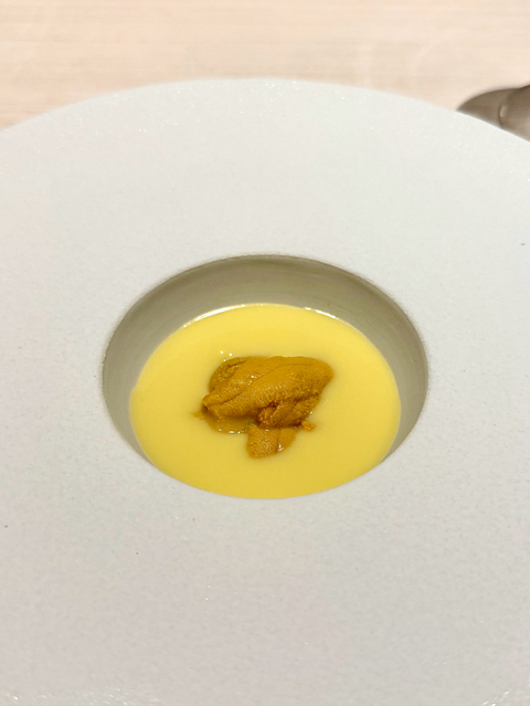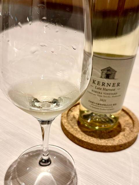 余市Loopでの日本ワインのペアリング・ディナー。 トウモロコシと雲丹に合わせて北海道中央葡萄酒株式会社・千歳ワイナリーのケルナー・レイト・ハーベスト・キムラ・ヴィンヤード2021を頂きました。 とてもペールなストロー・イエローからマスカットや白桃、ハニーなどのフレッシュで甘美なアロマ。 甘口ワインらしいとろっとした綺麗で甘い果実味で、酸がバランス良く感じフラワリーでフルーティなエンディング。とても良く出来た甘口ワインでしたが、トウモロコシに浮かべた雲丹のスープとの相性は今ひとつでした。