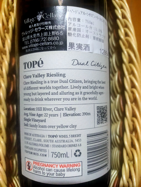 トペ・ワインズのデュアル・シチズン・リースリング 国際品種の白ブドウで一番好きな品種はと聞かれれば、リースリングと答えると思います。オーストラリアのリースリングは結構飲んできたつもり、といっても20本ぐらいかな。クレア・ヴァレーは素晴らしい産地だと思いますが、そういや本場ドイツのリースリングは久しく飲んでないです。 淡い緑がかった麦藁色。白粉、りんご。 やらわかな舌触り。果実味はふくよかで、リースリングらしい一貫した特異な酸味を感じます。誤解を恐れずに言うと人工的な雰囲気を感じるリースリングで、独特な「ケーキ感」「肌感」があります。それも含めて楽しめるというか、リースリングという品種の面白さを再認識できるワインでした。