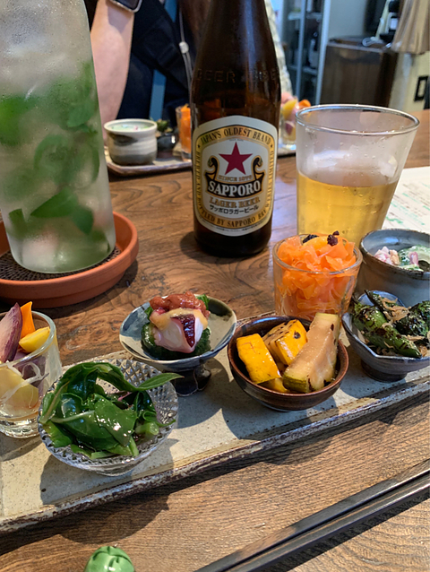 片手で食べれるカジュアルなワインのお店を紹介してもらい、まずはビールで乾杯♪ おばんざいが沢山あり白ワインをお願いしソムリエールお勧めの女性醸造家さんのシャルドネをチョイス。 さんが柔らかくミネラルが心地よいワインです。