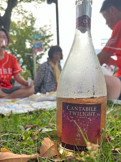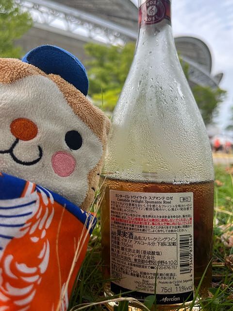 イタリアふらり旅 4周目 50 ナイター前の球場公園で しきもの敷いてオベント持って外飲み♪ カンタービレ トワイライト スプマンテ ロゼ 夕暮れ色は我がチーム色♪ スッキリしつつもほのかな甘さ グビグビプファ〜です(*´꒳`*)アハッ 母の作ってくれたおにぎり お兄もhiroさんも食べる食べる(笑) お兄は3個、hiroさんは4個 外で食べるおにぎりって 美味しい〜 スタジアムからの夕暮れ色も綺麗だった! 試合は負けなくて良かった(笑)