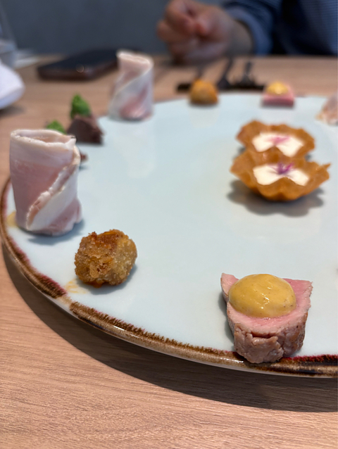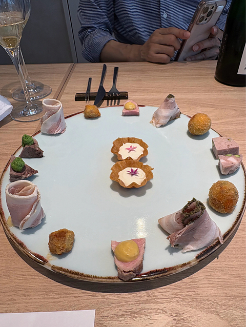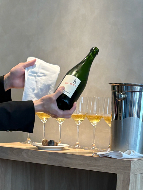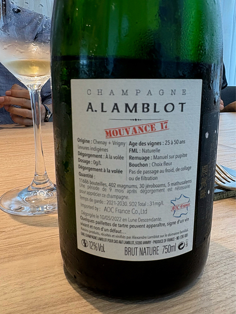 NV アレクサンドル・ランブロ キュヴェ・ムーヴァンス 17 ブリュット・ナチュール シュネ/ヴリニィ モンターニュ・ド・ランス シャンパーニュ/フランス vinicaに感謝✨ 9/27ワイン会@神田三崎町 divino・その2 2本目も、同じモンターニュ・ド・ランス産のシャンパーニュです。 meryLさんが持参された、2本の内の1本目、アレクサンドル・ランブロ キュヴェ・ムーヴァンス 17。 このつくり手は、シャンパーニュでもっとも長い歴史を持つ栽培農家の13代目当主で、ジェローム・プレヴォーの薫陶を受けた方だそうです。 2014年から、ぶどう作りをビオディナミに移行しているそうなので、ベースワインが2017年産と思しき、この「ムーヴァンス 17」も、認証マークこそ見当たりませんが、ビオディナミによるワインだと思われます。 こちらは、ノン・ドザージュのブリュット・ナチュール、デコルジュマンは2022年10月5日、シャルドネ、ピノ・ノワール、ムニエを1/3ずつ、均等にアサンブラージュしているそうです。 最初にグラスに注がれた瞬間から、サヴァールとの見た目の違いに参加者全員、思わず響(どよ)めきました(笑) 外観は、単独で見れば、透明度の高い淡い黄金色という印象ですが、サヴァールの直後では、かなり濃いめの明るくクリアなライトゴールドに見えます。 そうですね、サヴァールより2段階ぐらい強い色味でしょうか? デコルジュマンの日付は1年ほど遅いですが、こちらの方が熟成が進んでいるような見た目です。 香りは、華やかでよく熟した果実…アプリコットとか黄桃、スモモのような系統で、青い柑橘感は弱め、しっとりとしたボリューム感のある香りですね♪ 口当たりは柔らかですが、味わいは意外にスッキリしていて、伸びやかな酸、果実の旨み、微かな塩味や苦みを含む豊かなミネラルなど、味覚要素のまとまりとバランスが素晴らしく、全体に軽やかさを感じる味わいでした。 余韻は長く、拡がりのある感じ…。 深く刺さるようなサヴァールに対して、こちらは、拡がって包みまれるような柔らかな余韻ですね♡ タイプの異なる、素晴らしいシャンパーニュの飲み比べとなりましたが、どちらとも甲乙つけ難い、素敵な2本の組み合わせでした✨ さて、恒例(?)の、ワイン名についての考察です(笑) フランス語の「ムーヴァンス/mouvance」は、ネットで調べたところ、以下のような意味を持つ女性名詞だそうです。 【mouvance /muvɑ̃ːs】[女] ① 影響の及ぶ範囲 領域 勢力圏 ② 流動性 不安定 動き ③ (封土間の)従属関係[歴史用語] 先に触れたように、ジェローム・プレヴォーのお弟子さんですから、この名前には、直接の師匠や、さらにその源流にあたるジャック・セロスの系統へのリスペクトが感じられます(特に語義の③)。 同時に、そのような関係性の中でも、自身の哲学や信念から、独自のワインづくりに邁進して、自らの「領域」を確立した、揺るぎない自信のようなものを、私は受け止めました。 meryLさん、美味しいだけじゃなく、後になって深掘りするほどに学びが得られ、楽しみが増す、素晴らしいシャンパーニュをご馳走様でした!