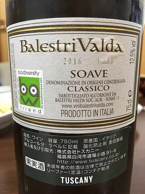 バレストリ・ヴァルダ ソアーヴェ クラッシコ 少し濃いめの黄色。 黄色系果実、ほんのり白桃、スーッとする香り。 口当たりから生き生きした酸味を感じる。 しなやかなボディだが、中心に芯がある味わい。 果実味は強く、余韻には蜜を感じる。 しばらくすると、マコンのシャルドネのような感じもあり、甘露感も出てくる。 ソアーヴェらしくはないが、これはこれで美味しい♪ 合わせたのは、 鰤と鯛のお刺身 海老すり身の春巻 えのき他の豚肉巻き 玉子炒飯 春巻にかけたお塩と肉巻きの濃さとは合ったかな。