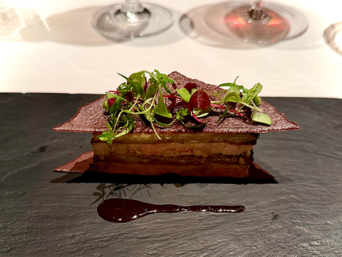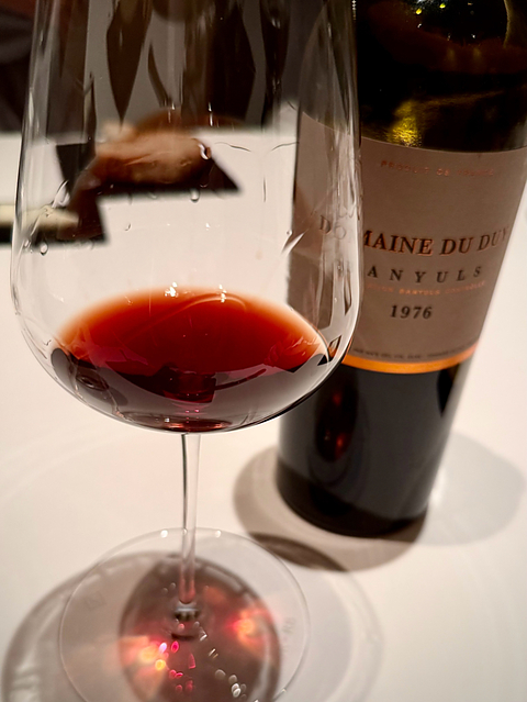 御殿山のグラン・メゾンへ、いつものメンバーの皆様と。 フォアグラとナスとカカオのプレッセに合わせたのはドメーヌ・ド・デュイ・バニュルス1976を頂きました。 全体的にオレンジかかった濁りのあるルビー・ガーネット。 プルーンや無花果などのダーク・ドライ・フルーツにカラントやベリー、スパイスにアルコール、カラメルなどの甘口食後酒のアロマ。 甘美で、綺麗なしっかりとした芯のある果実味で、スパイシーな酸味からの程よいタンニン、少しタウニー・ポートの様なナッツやカラメルが香る長い余韻。 良くチョコレートのデザートにバニュルスを合わせますが、濃厚なフォアグラとカカオとの食中マリアージュもとても秀悦でした。