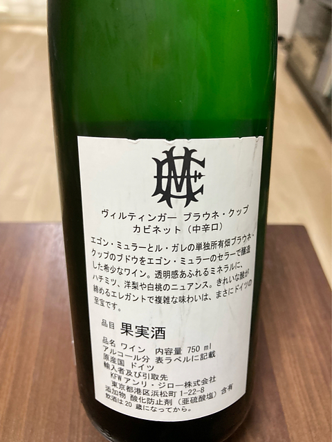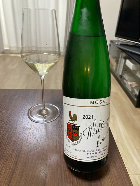 エゴン・ミュラーのヴィルティンガー・ブラウネ・クップ・カビネット2021。ブドウはモーゼルのザール・ルーバー地区のブラウネ・クップという畑のリースリング100%。畑は川の近くの日射量が多い場所で、土壌は多くの鉄分を含んでいるとのこと。味わいは輸入元の記載ではやや甘口(裏ラベルは中辛口)とあるように少し甘さが有り、甘さの奥にワインのエキスみたいなものと柑橘を思わせる酸があります。なんとなくネーブルオレンジのような味わいを感じます。ただ2021年だけでしょうかミネラルは影に隠れている感じです。